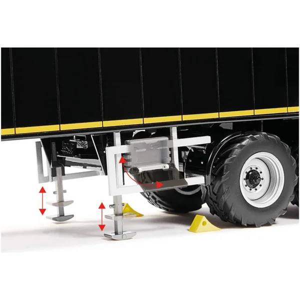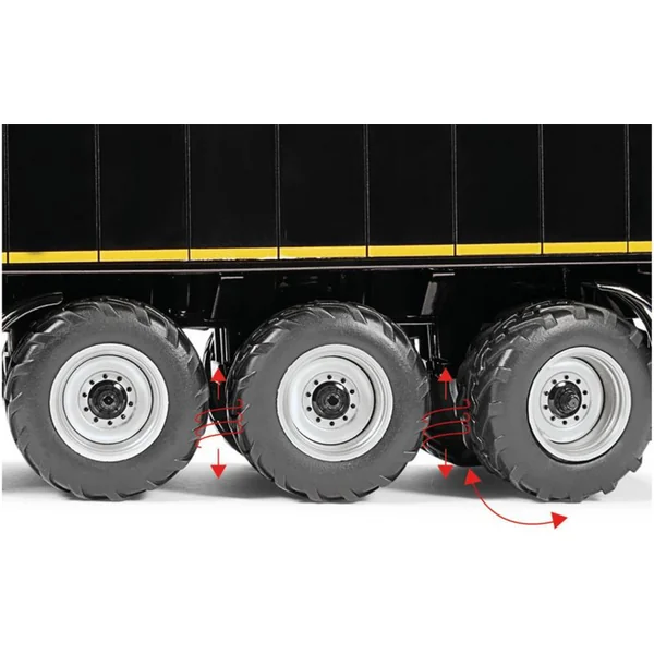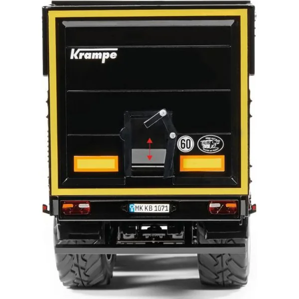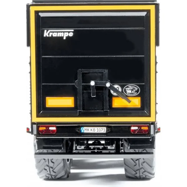 Remorque à trois essieux Krampe SB II 30/1070 – noire, à l’échelle 1:32. – accessoire pour modèles réduits en métal de tracteurs Wiking 1:32. Comprend une suspension fonctionnelle des roues avec un essieu arrière directionnel, un essieu relevable, un front ouvrant avec une ouverture pour un dosage précis, des béquilles rétractables, des roues en caoutchouc et des cales de roues. Sur le côté gauche se trouve un compartiment à outils ouvrant. Fabrication de qualité en métal et plastique.