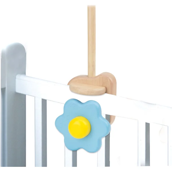 Il se fixe à la balustrade du lit avec une grande roue pratique à motif de fleur, ce qui permet de le fixer solidement et de l’enlever facilement si nécessaire. À son extrémité, il est équipé d’une boucle pour suspendre le mobile.