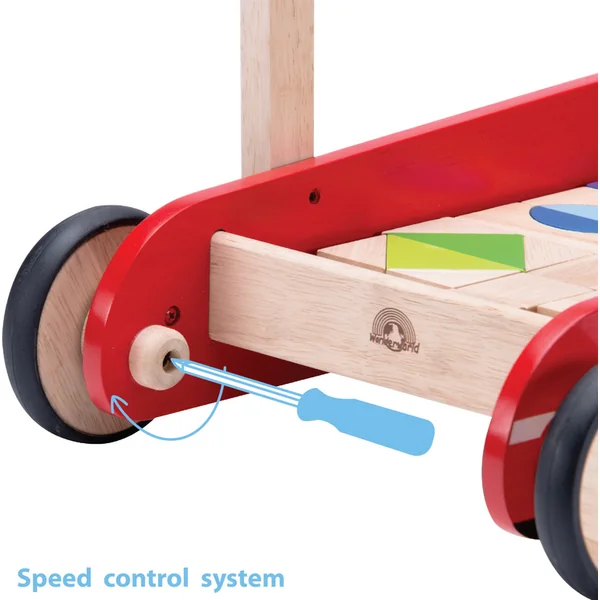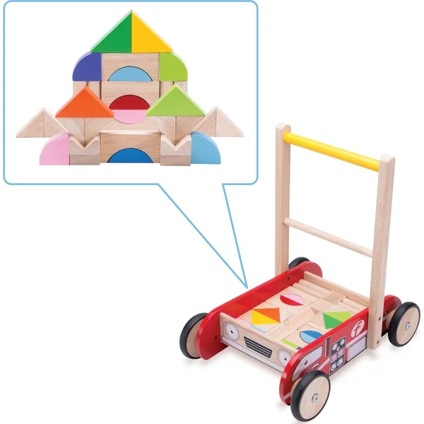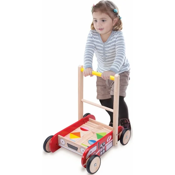 Le trotteur en forme de camion de pompiers contient un ensemble de blocs principalement en bois naturel, mais il est bien sûr possible de transporter d’autres jouets avec. L’effort de bien ranger les blocs dans le trotteur enrichit le jeu d’un test d’ingéniosité.