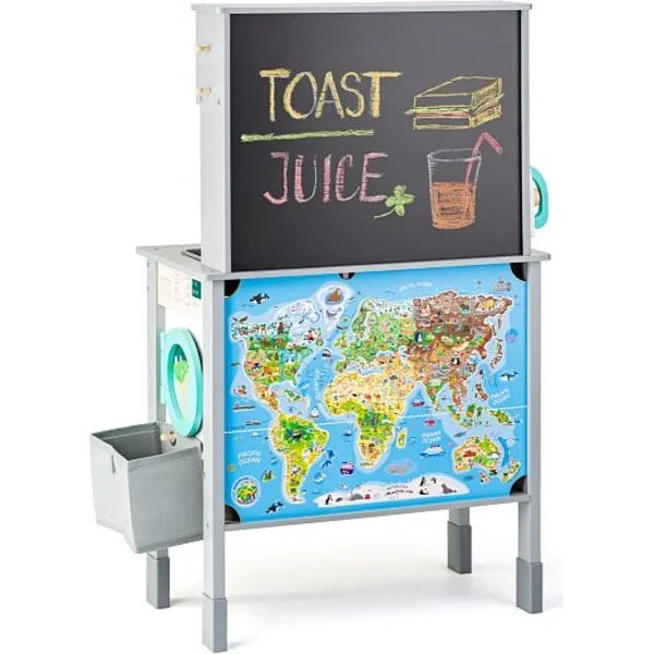 Cette cuisine multifonctionnelle offre une activité différente de chaque côté. Sur le devant, elle comprend un four, un micro-ondes avec lumière et son, une machine à café, un lave-vaisselle, un évier et une plaque de cuisson avec un éclairage rouge et des sons de cuisine réalistes. Sur le côté droit, l’enfant trouve une machine à laver avec un panier à linge, et sur le côté gauche, une planche à repasser avec un fer à repasser. L’arrière est constitué d’un tableau et d’une carte.