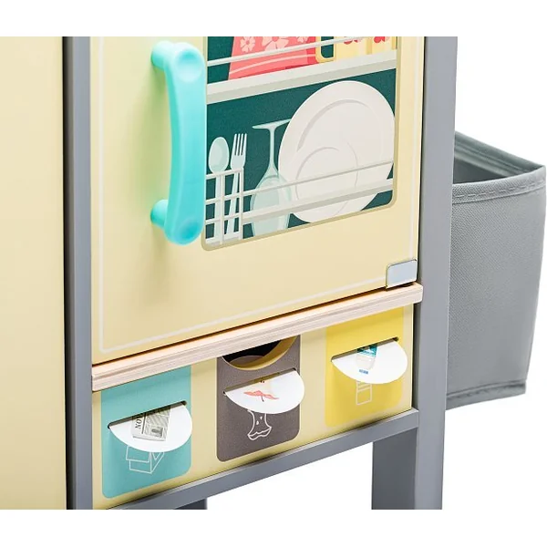En bonus, ce produit comprend également des cartes avec des images de déchets que l’enfant trie et insère dans les bonnes ouvertures pour le tri des déchets. Les accessoires comprennent de la vaisselle en plastique et en bois de qualité, ainsi qu’un tablier avec une toque de chef.