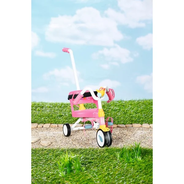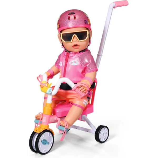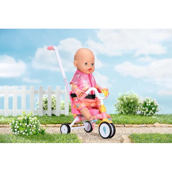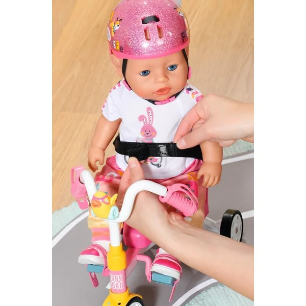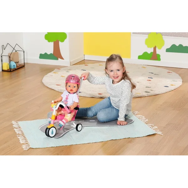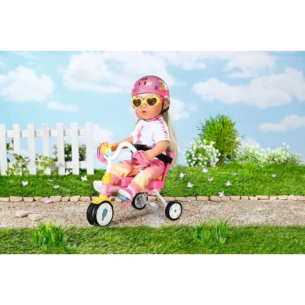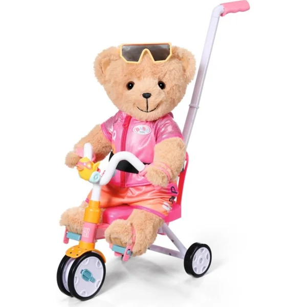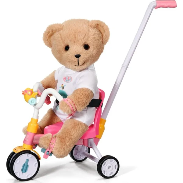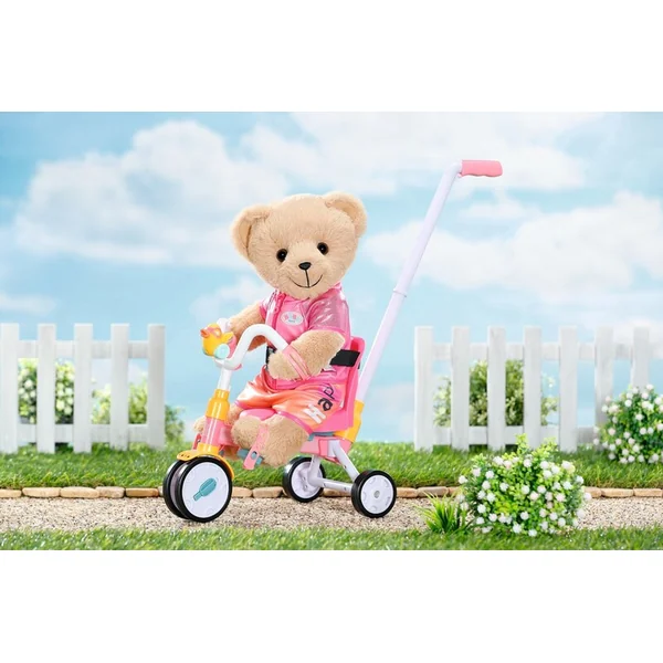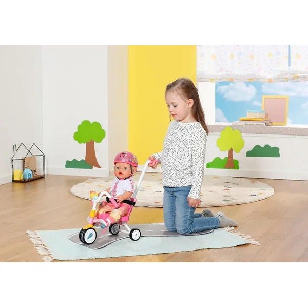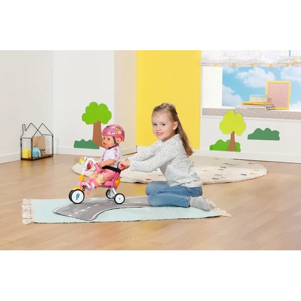 Attention, BABY born arrive ! Sur son nouveau tricycle, elle fait la course avec son ours en peluche Teddy et son amie Eva.