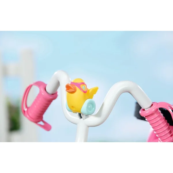 Grâce aux roues fonctionnelles, BABY born peut rouler sur son tricycle comme sur un véritable tricycle. Le klaxon en forme de canard Berty veille à ce que personne ne se mette sur son chemin. Les sangles sur les pédales et les ceintures de sécurité garantissent une conduite en toute sécurité. Pour empêcher BABY born de partir seule, une tige de guidage amovible de 45 cm est disponible, qui peut être fixée au tricycle. Cela signifie que BABY born peut également être emmenée en promenade sur le tricycle et poussée, tant que ses jambes ne sont pas trop lourdes.