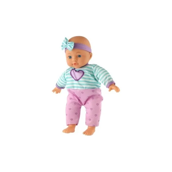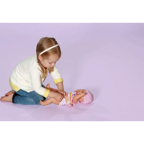 La figurine est habillée d’un vêtement doux de couleur rose avec un motif enfantin sur le devant. Elle porte un bonnet avec un léger motif rayé. La tête, les bras et les jambes de la poupée sont mobiles.