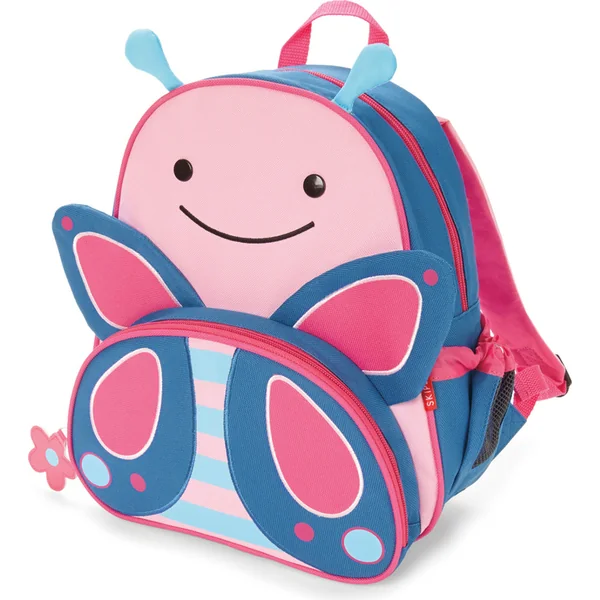 Beau petit sac à dos avec un motif de papillon. Le sac à dos a une poche avant séparée idéale pour le goûter avec un compartiment supplémentaire pour des crayons ou d’autres petites choses. Sur le côté, il y a une grande poche en filet adaptée pour boire. Les détails soignés du sac à dos s’harmonisent avec les motifs joyeux sur la fermeture éclair.
